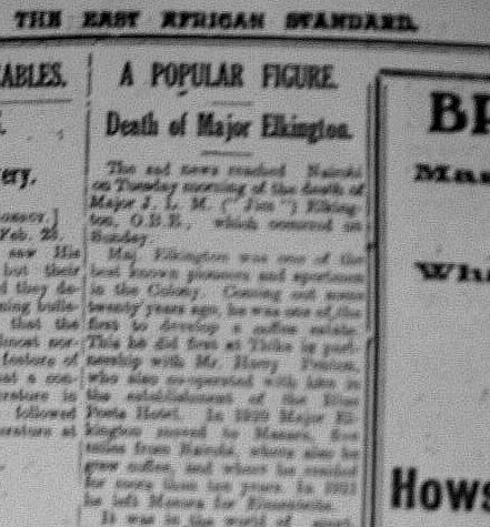 Maj. Elkington was one of the best known pioneers and sportsmen in the Colony. Coming out some twenty years ago, he was one of the first to develop a coffee estate. In 1910 Major Elkington moved to Masara, five miles from Nairobi, where also he grew coffee and where he resided for more than ten years. In 1921 he left Masara for Elmenteita.